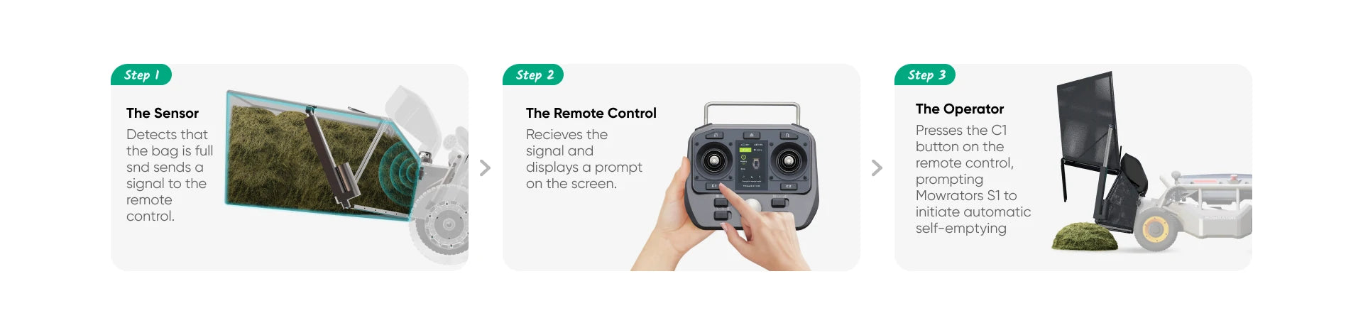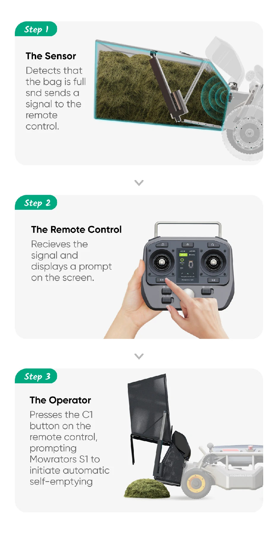 - Mowrator S1's patented auto-dumping system spares you the hassle of manual removal.