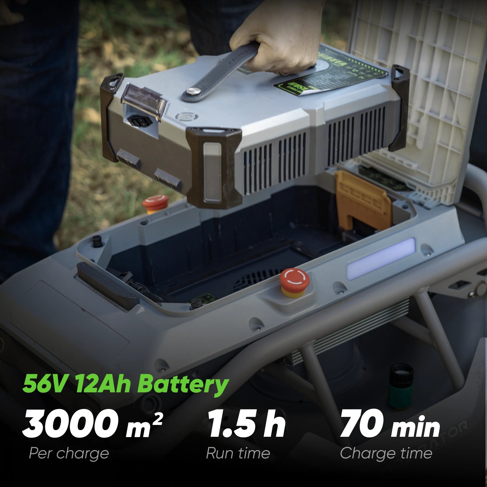 Automotive-grade 56V 12Ah LiFePo4 battery delivers 1.5 hours of non-stop mowing, and the 600W Supercharger fully charges it in 70 mins-all making large-area mowing effortless and worry-free.
