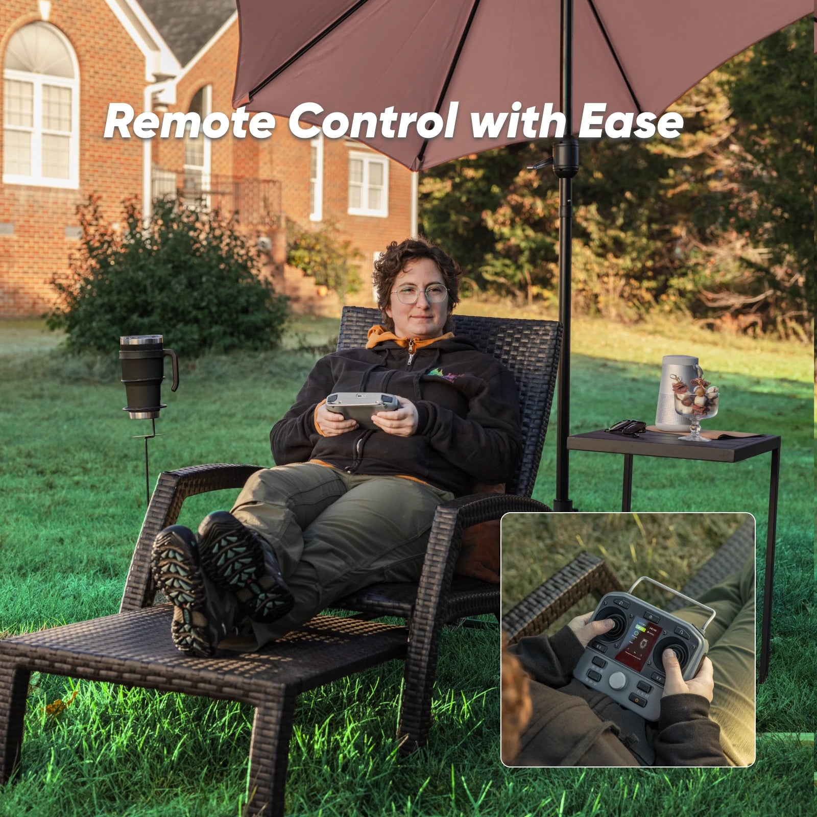 Operate from your porch, patio, or shaded driveway. Clear line of sight, full control. Your legs rest. Your lawn gets cut.